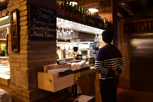 Une rénovation complète de l’intérieur en préservant le charme d’antan. Nous sommes dans le quartier gothique donc l’intérieur n’a pas été aménagé de manière moderne mais plutôt en préservant le charme des vielles pierre et le mobilier de bistrot. Murs de pierres, plafond poutré, tables de marbres, c’est agréablement décoré. Tables dans diverses section, hautes, basses, dans une pièce avec quelques sections. Eclairage adapté, ambiance décontractée et très agréable.