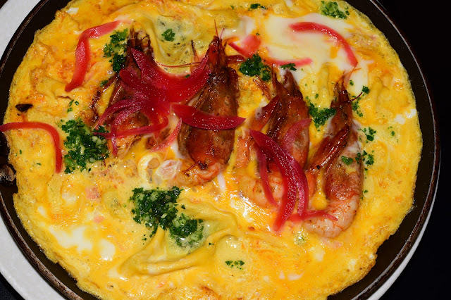 plats phares, la tortilla ou omelette ouverte aux crevettes rouges. Ouverte car