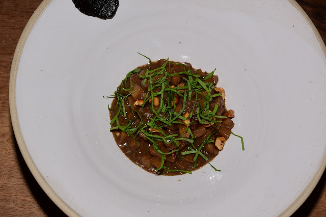 Le premier plat végétal qui est risotto de céleri avec une sauce à base d’ail noir sur le bord de l’assiette, des noisettes du piémont broyées et de l’oseille ciselé. Peut-être mon plat préféré car c’est très gourmand et une agréable texture.