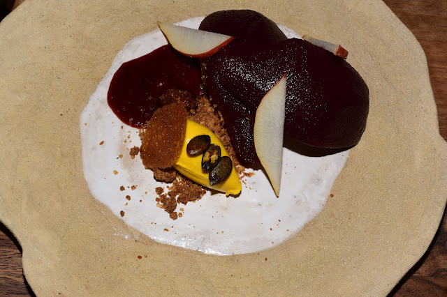 Deux desserts très différents et qui se complètent bien, au choix. Le potimarron en glace avec sa poire vin chaud aux épices, savoureuse et réconfortante.